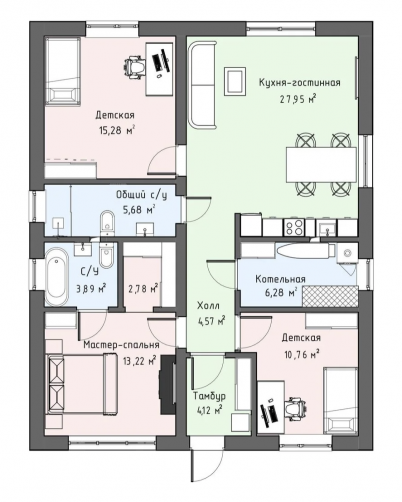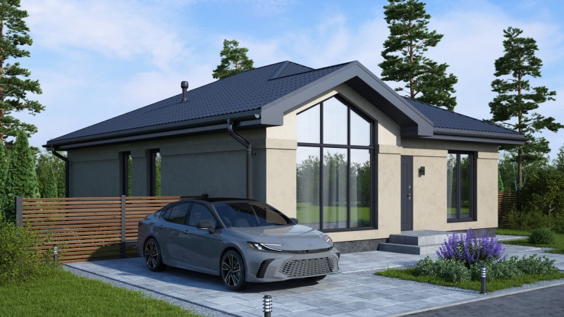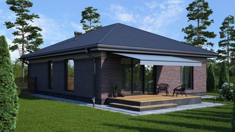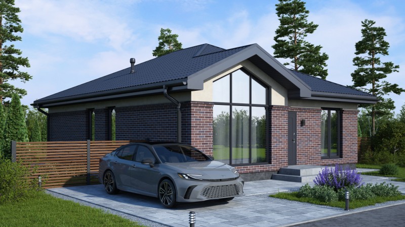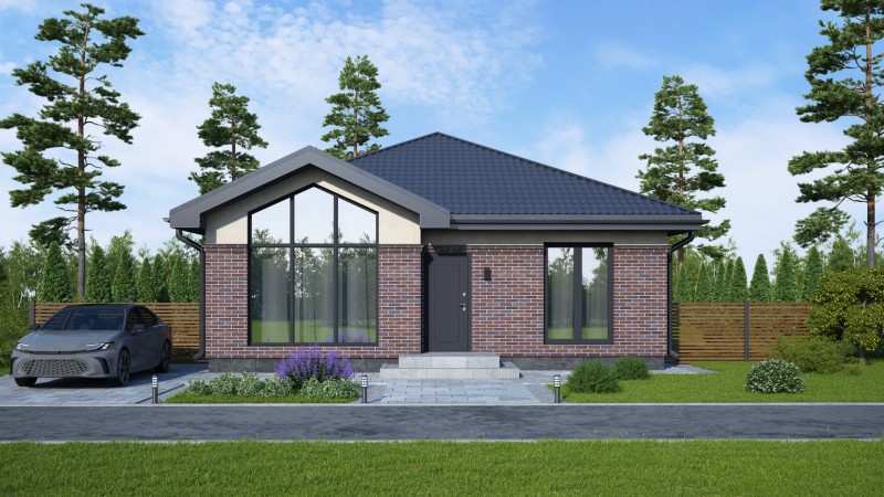 Функциональный одноэтажный дом с оригинальными комбинированными фасадами, интересной кровлей. Имеет три спальни, одна из них мастер спальня с гардеробной и санузлом, просторную кухню гостиную с выходом на задний двор, котельную‑постирочную, второй санузел.