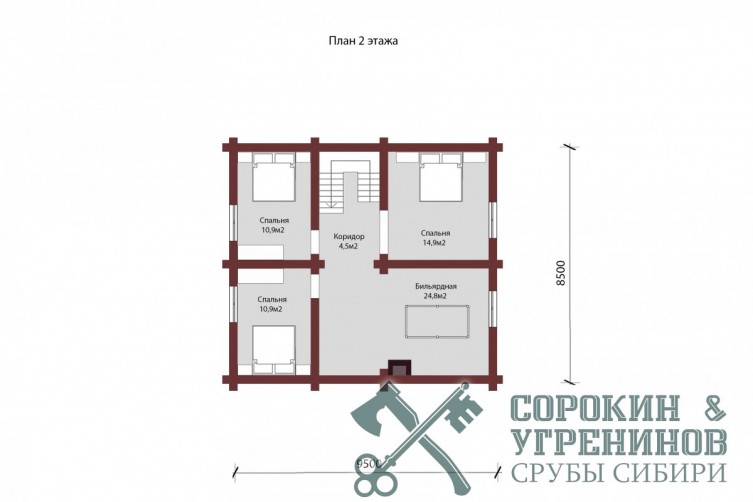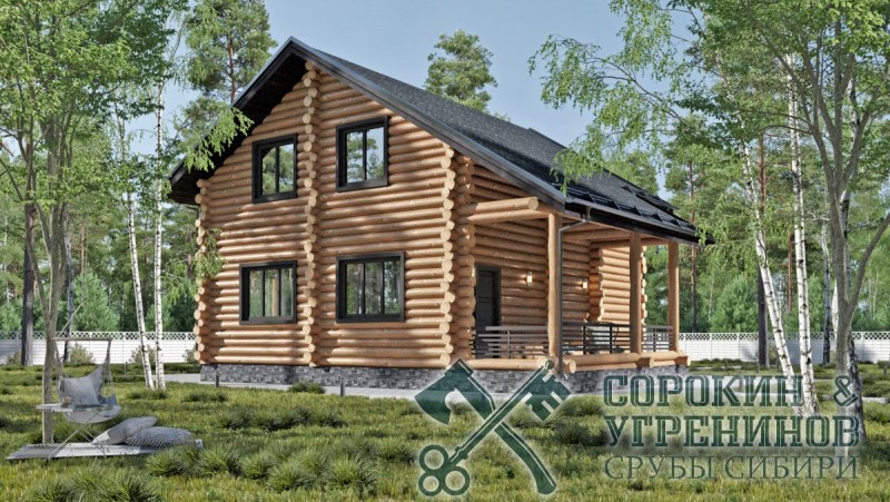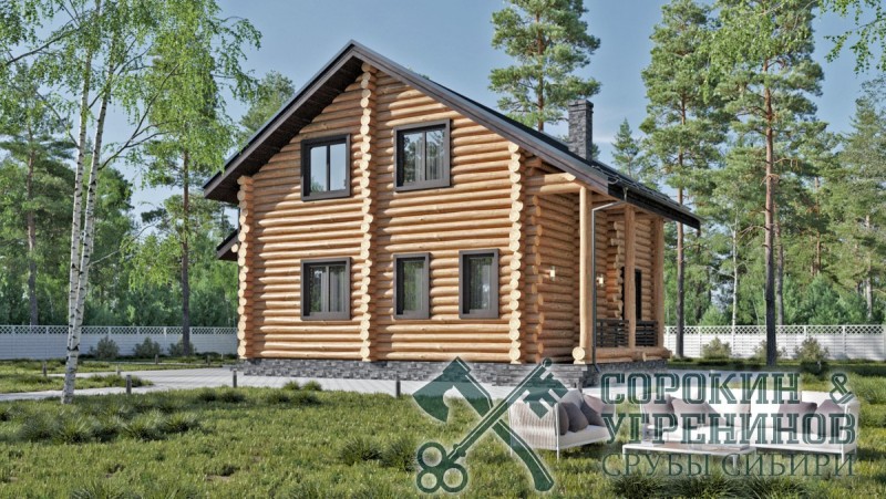 Проект дома из бревна диаметром 260мм, площадь дома 157м2. Размер сруба 9,2х12 метров. Первый этаж имеет два противоположных входа с крыльцом, прихожую, котельную, санузел, гостиную, кухню, и небольшую комнату. На втором этаже три спальные комнаты, и большая бильярдная комната. Дом построен в Новосибирске в поселке Пашино в 2014 году.