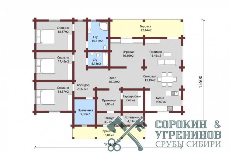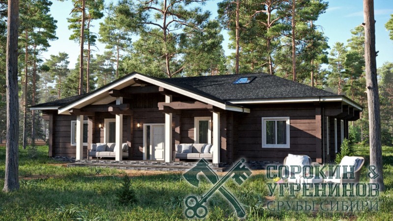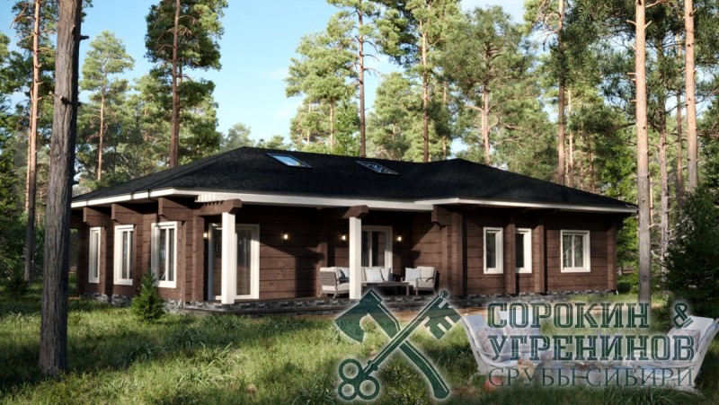 Индивидуальный проект одноэтажного жилого дома из лафета сечением 250х400мм. Общая площадь дома 266м2. Высокие потолки 3 метра, есть холодный чердак более 100м2. Два выхода с террасой, три спальные комнаты, большая светлая гостиная совмещена с кухней, большая детская игровая комната и одна спальная, большой коридор, тамбур, техническая комната, гардеробная, прачечная, два санузла. Дом установлен в Новосибирске в районе Кольцово в 2020 году.