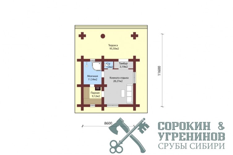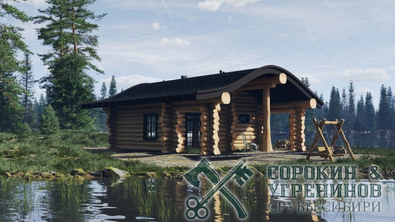 Сруб бани рубленый из бревна кедра диаметра 320мм, площадью 54,5м2 жилая и терраса 95м2. Размер сруба 8,6х11,6 метров по осям с учетом открытой террасы. Простая планировка бани, парная, душевая, комната отдыха, санузел, и большая терраса. Необычный вид создает стропильная система кровли из гнутых стропильных балок. Такая кровля будет дороже за счет гнутых клееных стропильных балок. Сруб рубленый вручную в русскую чашу (охлоп), брёвна окоренные гидро-окоркой (водой под высоким давлением), а так, же это можно сделать скобелем или лопатой, или строганное рубанком. Объем бревна в срубе 65м3.