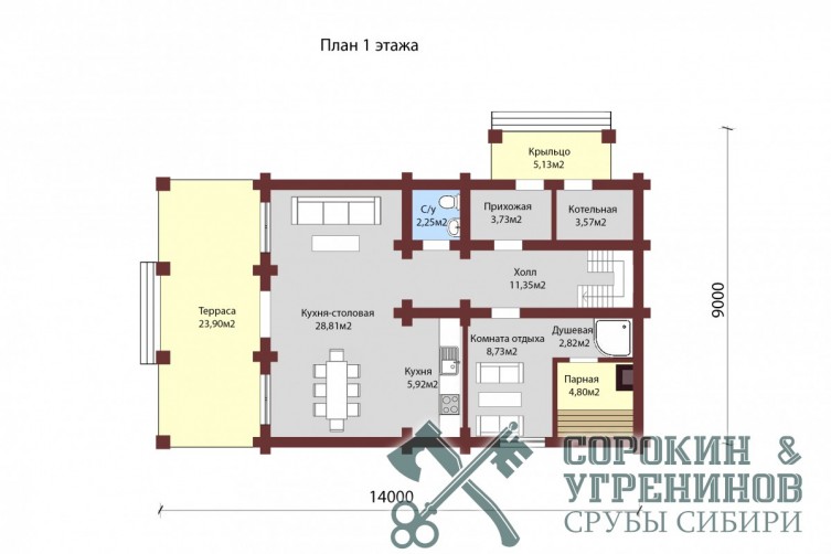 Проект дома с баней из лафета сечением 250х400мм, площадь дома 131м2. Размер сруба дома 9х14 метров. Два этажа, небольшой второй этаж мансардный. Дом выполнен в Норвежском стиле, на первом этаже гостиная совмещена с кухней, есть парная с комнатой отдыха, санузел, прихожая, котельная, и большая терраса. Лестница на второй этаж, где находится две комнаты и санузел. Хороший теплый дом для круглогодичного проживания, с баней.