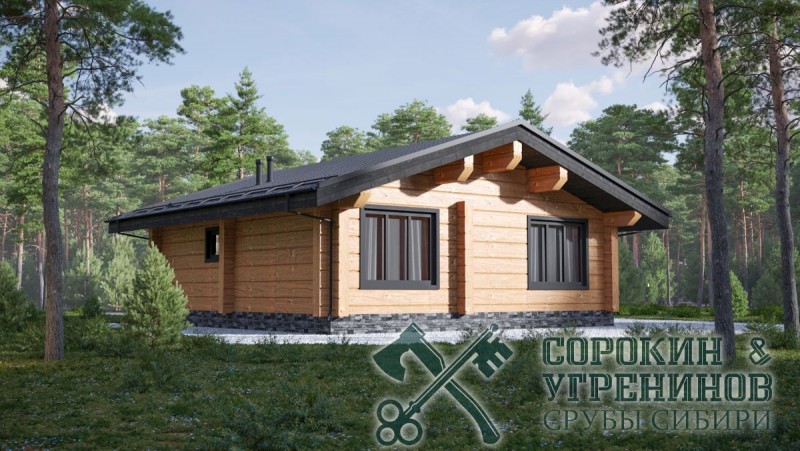Проект загородного дома с баней внутри, рубленый из лафета сечением 250х400мм. Общая площадь дома 75м2. Одноэтажный дом имеет одну спальную комнату, есть просторная гостиная с кухней, парную с печью на дровах, душевая, и санузел, прихожая с гардеробом, и крыльцо.